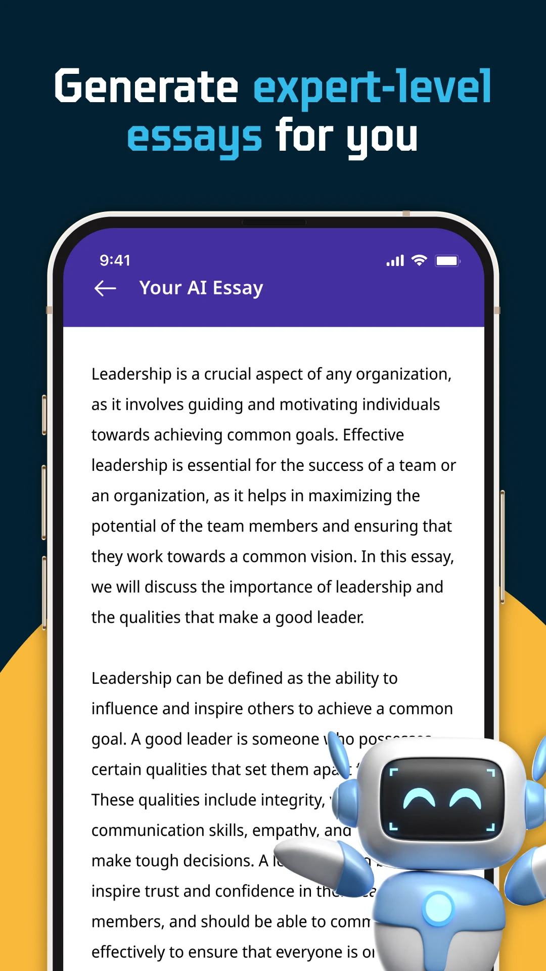 AI Essay Writer for creating compelling reports, proposals, and articles. Even casual writers can benefit from the app's user-friendly interface and language-specific features to refine their writing skills and unleash their creativity. With its AI-powered tools and user-centric design, the AI Essay Writer Android application is a must-have for anyone looking to unlock infinite writing possibilities, streamline their writing process, and elevate the quality of their essays. Whether you are a student, a professional, or simply someone who enjoys crafting written content, this innovative app is here to support and enhance your writing journey.