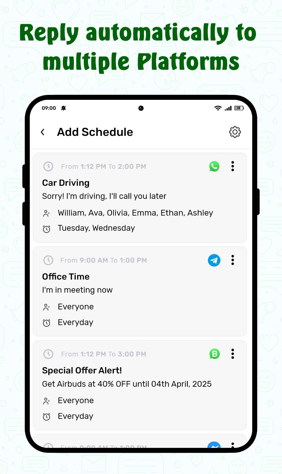 2. Schedule Customization: Users can create detailed schedules for when auto replies should be activated. Whether it’s for specific hours of the day or on particular dates, this feature offers flexibility in managing when you’re reachable and when you're offline.