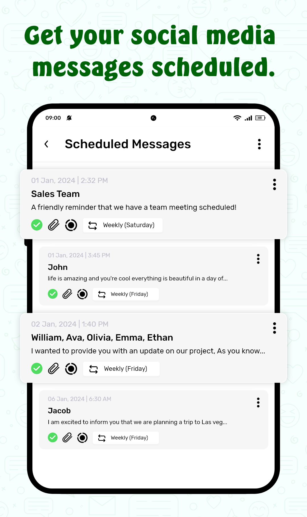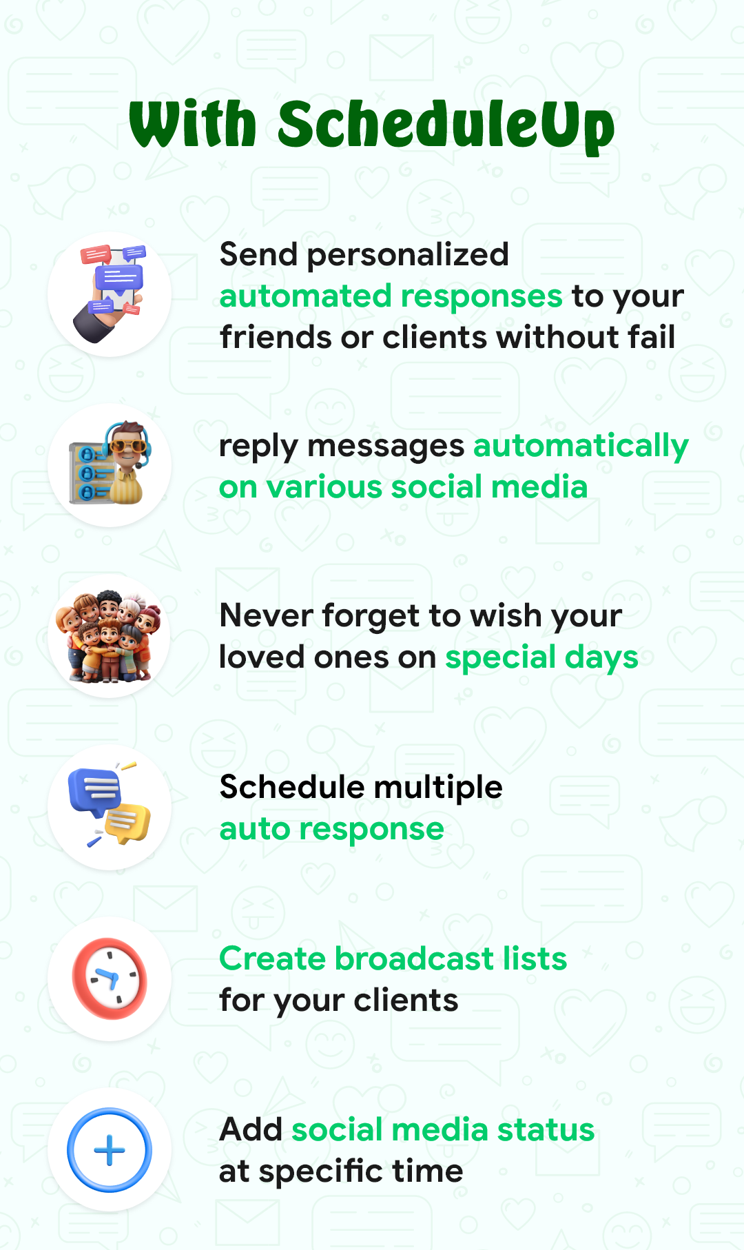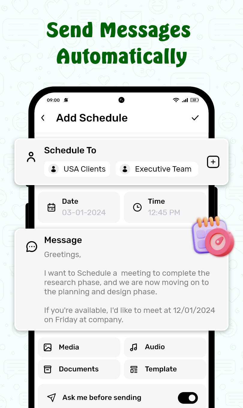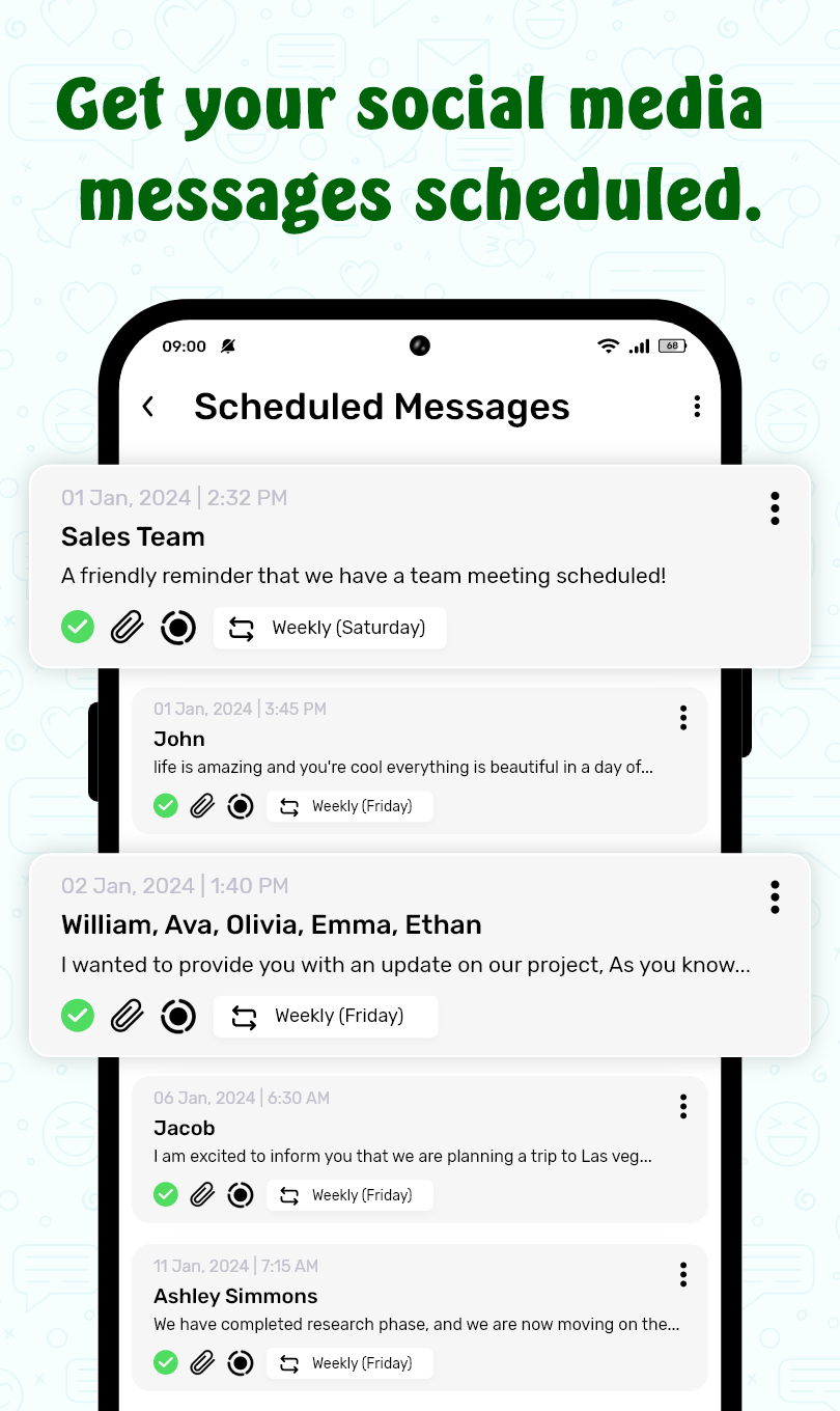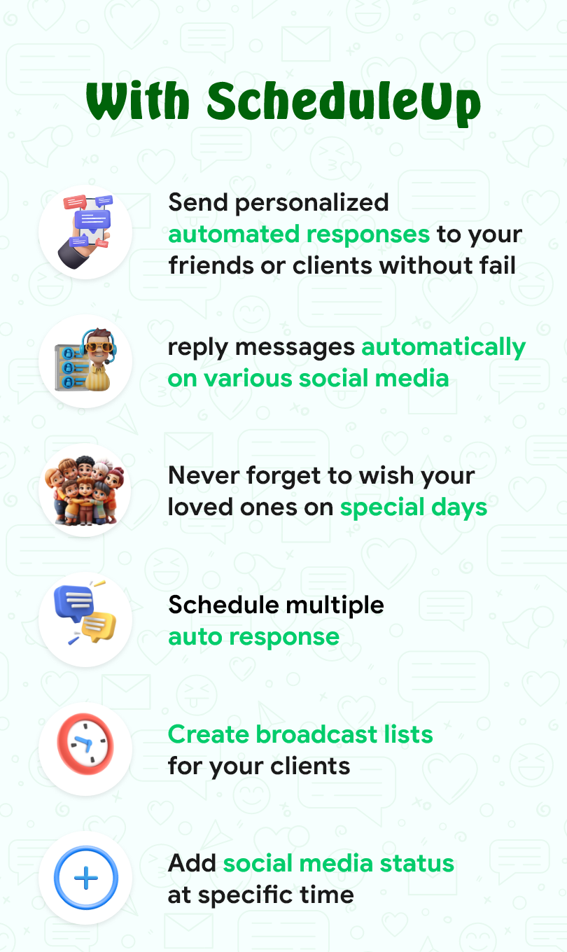 - ScheduleUP supports a wide range of messaging apps, including SMS, WhatsApp, and other popular messaging platforms. However, there may be occasional limitations with some third-party apps, depending on the device or operating system version.