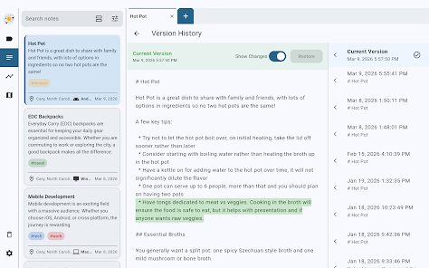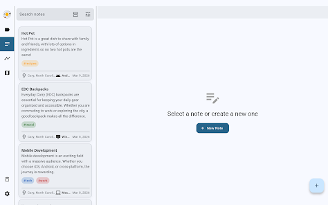 Better recall through association: contextual metadata helps you rediscover ideas by location or time rather than by memory alone. Local storage and search keep data private and responsive, while encrypted cloud backups enable recovery and cross-device access. Portable plain Markdown storage keeps notes readable and compatible with other tools and AI workflows. A clean, distraction-reduced interface combined with fast search and timeline/map views supports everyday productivity.