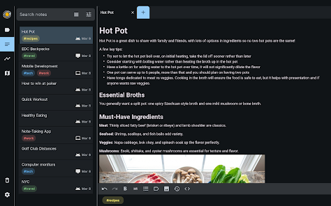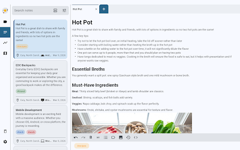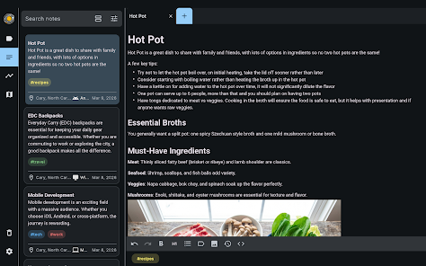 MemNote provides a fast, lightweight mobile experience with offline-first reliability. Context logging passively records location, time, and device for each entry. Browseable map and timeline views help you find notes by place or moment in addition to full-text search. Native Markdown with LaTeX extensions is supported and you can export an organized ZIP that retains attachments and YAML front-matter. Cross-platform synchronization uses encrypted backups while keeping search and storage local for performance.