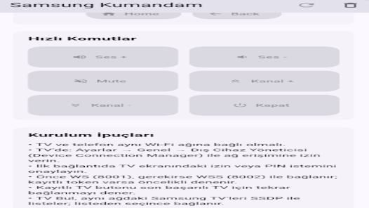 Samsung Kumandam is a lightweight remote control app that turns your Android phone into a controller for compatible Samsung Smart TVs. When your phone and TV are connected to the same Wi-Fi network, the app pairs with the television so you can operate directional controls, OK/confirm, Home and Back, volume and mute, and channel switching from a single, easy-to-read screen. It suits anyone who misplaces a physical remote or prefers quick, touch-based control. Setup is minimal — connect both devices to the same network and accept any on-screen pairing prompts to start using core remote functions.