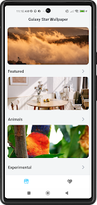 Galaxy Star Wallpaper includes handpicked featured wallpapers that highlight the best images and visual themes, multiple categories to explore such as Featured, Animals, Experimental and Nature that are updated regularly, smooth and intuitive browsing with an uncluttered layout, high-definition images optimized for mobile screens to preserve clarity and fit, and the ability to save favorites for quick access and reuse.
