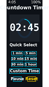 Create a new timer, set the target time and label, then start; timers continue running in the background and deliver alerts via notifications. Tap a widget or notification to pause, reset or edit a timer, and use presets for frequently used durations.