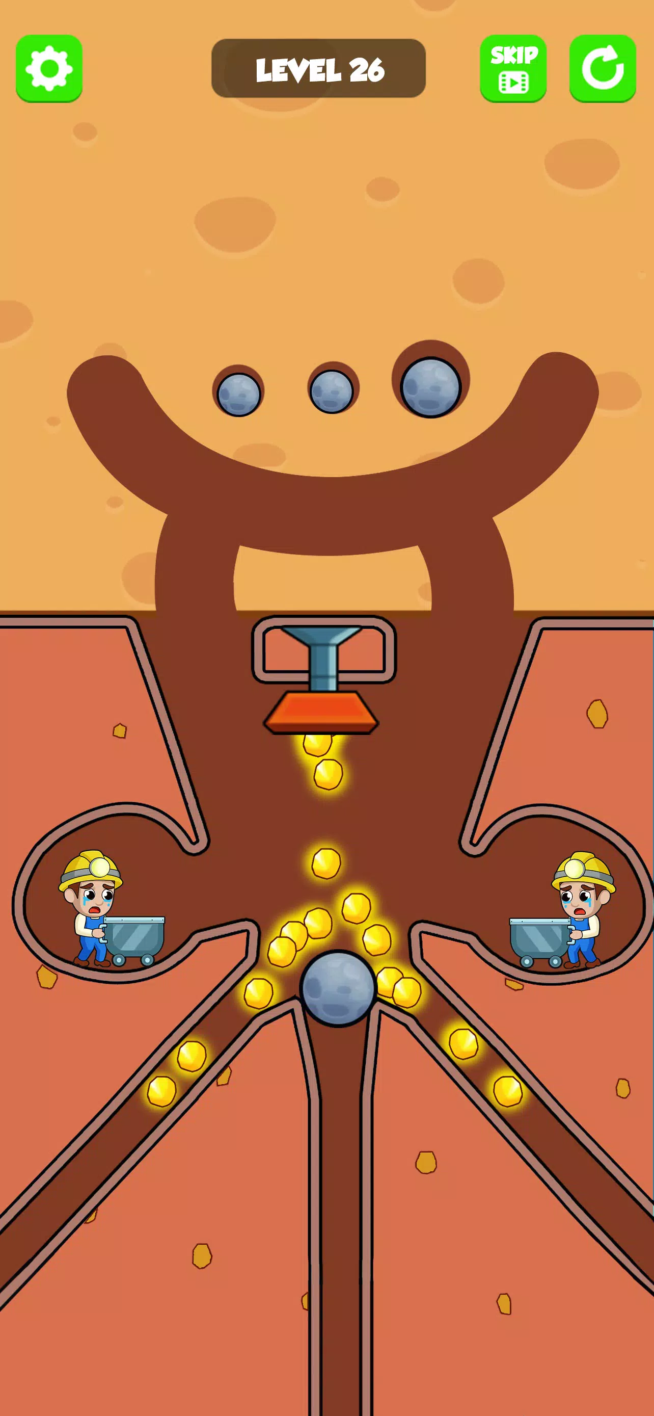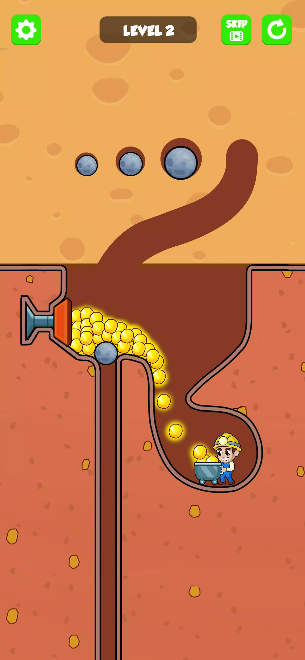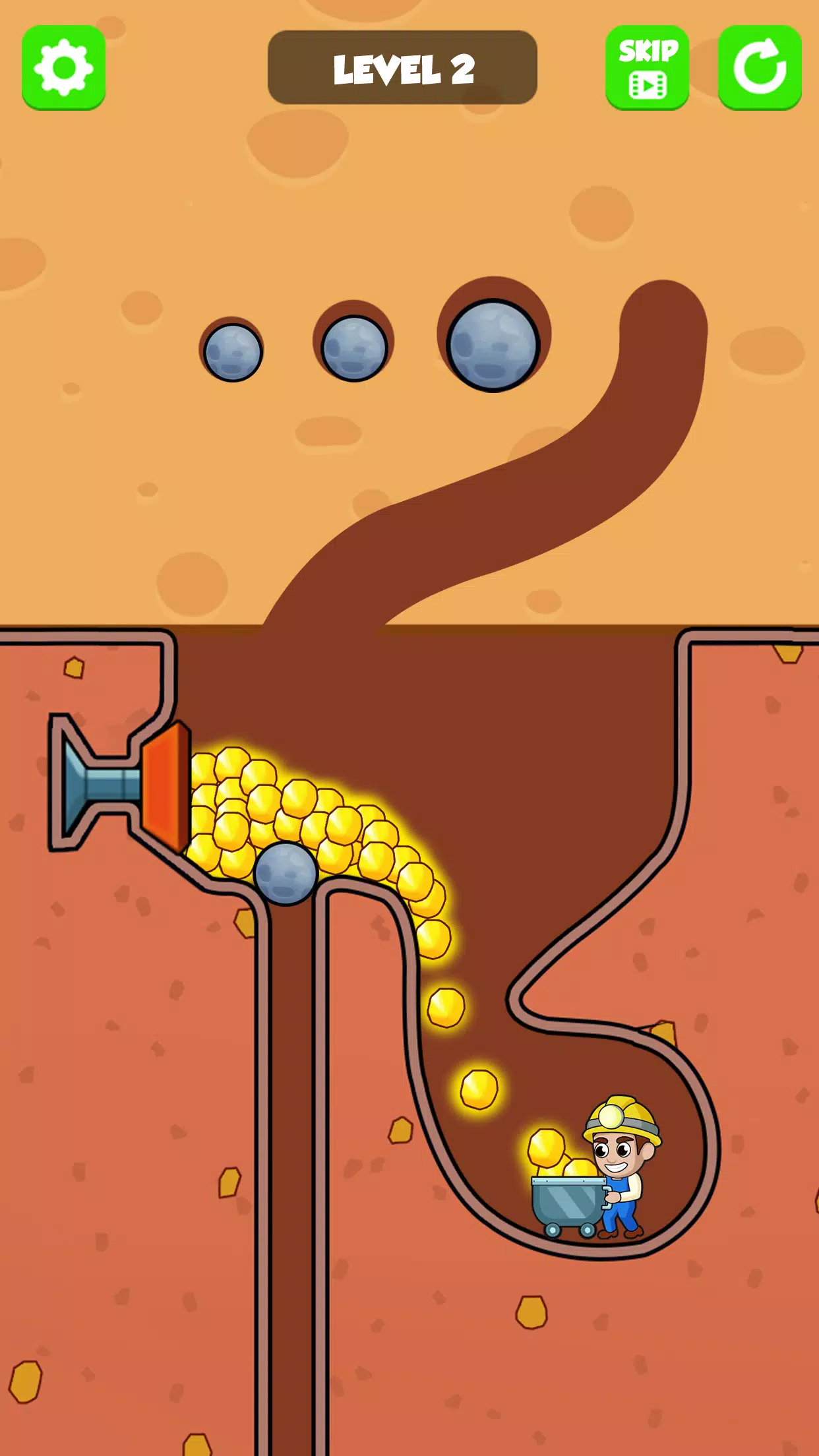 Where's My Gold is a physics-based puzzle game that puts players in control of a miner racing to collect gold from a leaky pipe. Through a series of bite-sized levels you cut away dirt to drop stone balls, plug deep holes, and guide molten gold into the miner's truck. The gameplay rewards planning over reflexes: direction and speed of cuts, and the size and placement of stones, decide success. Casual players will appreciate the simple touch controls and relaxing visuals, while puzzle fans will enjoy increasingly clever mechanics that demand strategy and precision.