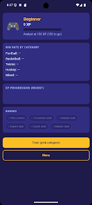 Sports Category Career Mode is a sports trivia game that turns single quizzes into a longer progression experience, ideal for players who want measurable improvement and ongoing challenges. This mobile adaptation of a web quiz offers a clean interface and smooth gameplay while tracking XP, ranks from Beginner to Master, badges, and win rates across specific sports categories. Instead of isolated rounds, each session contributes to a career-style progression so players can focus training on chosen sports and watch their category performance and overall knowledge develop over time.