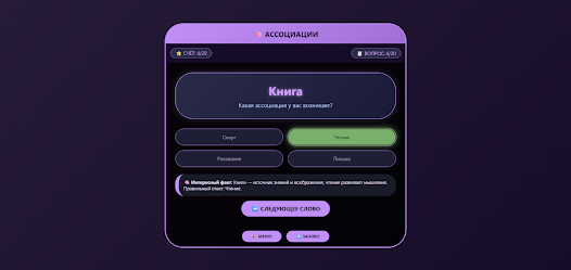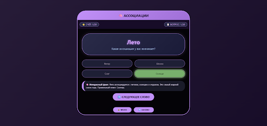 Ассоциации is a compact quiz game that challenges players to find the single best association for a given word. Each round presents one target word and several answer choices; your task is to pick the option that most accurately connects to the prompt. The mechanic rewards logical thinking and close attention, since only one answer is correct and guesses are explained. After each selection you see the correct association plus a short fact that explains why that choice fits, which turns every question into both a puzzle and a quick learning moment. This mix of challenge and explanation keeps rounds engaging for casual players.