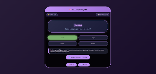 ⭐ Ассоциации presents multiple-choice rounds where you must match a word to its most fitting association.