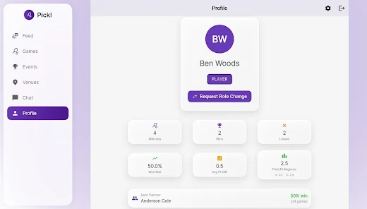 PickLM - Pickleball App records basic match results and player profiles to review recent performance and plan practice sessions.