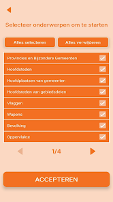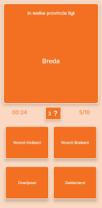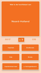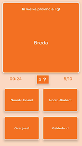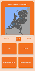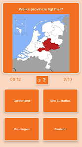 Nederland Geografie Kaartquiz helps you learn the map of the Netherlands through map-based challenges and timed questions. The app focuses on provinces, capitals, main towns, special municipalities, flags, coats of arms, rivers, lakes and islands, offering an interactive way for students, travelers and geography enthusiasts to test and improve Dutch geography skills.